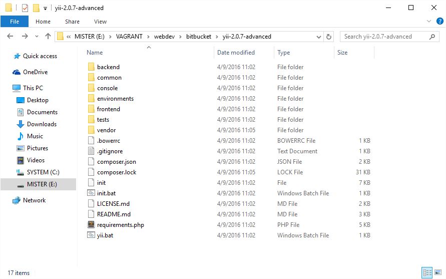 Struktur direktori Yii 2.0 Advanced hasil perubahan seperti gambar di bawah ini :