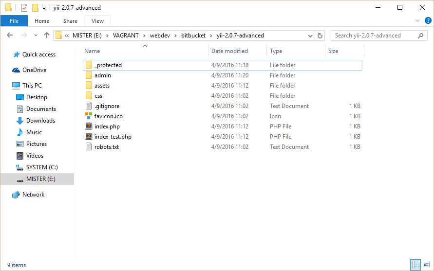 2. Pindahkan semua direktori dan file Yii 2.0 Advanced kedalam folder _protected yang telah dibuat.